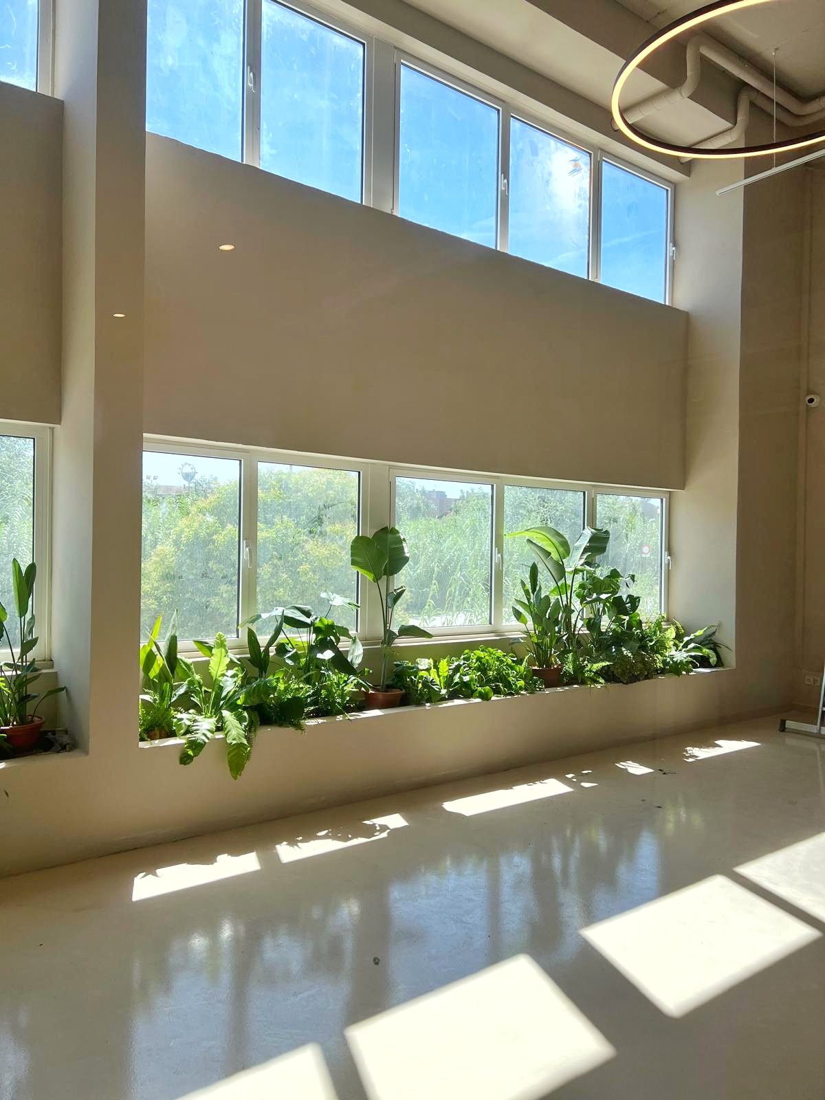 Les jardineres es troben situades al costat de grans finestrals amb una entrada abundant de llum natural i amb una alçada interior notable, generant un espai molt lluminós i amb una forta presència arquitectònica.